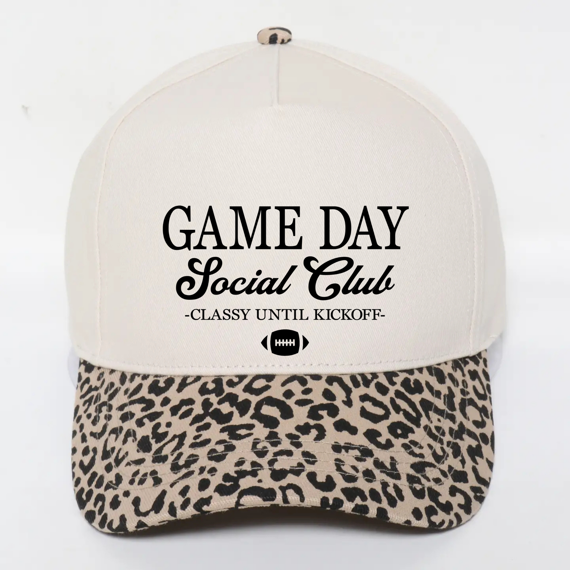 Turn heads on game day with the perfect mix of classy and fierce! This Game Day Social Club Hat combines bold lettering with a stylish leopard print bill, making it the ultimate accessory for football fans who love to stand out.