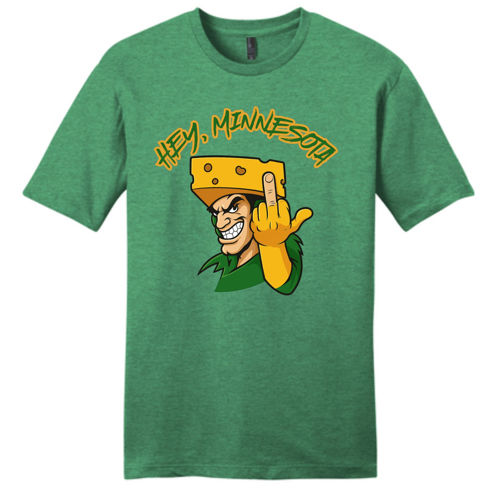 Show your game-day grit with this unapologetic Hey, Minnesota tee. Featuring a grinning cheesehead character with plenty of attitude, this shirt is built for die-hard fans who live for the rivalry. Printed in bold team colors on a soft green tee, it’s the perfect blend of comfort and smack talk.