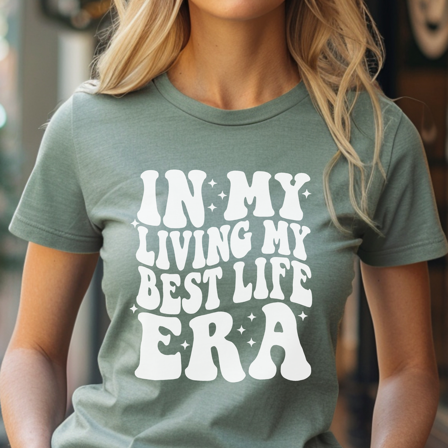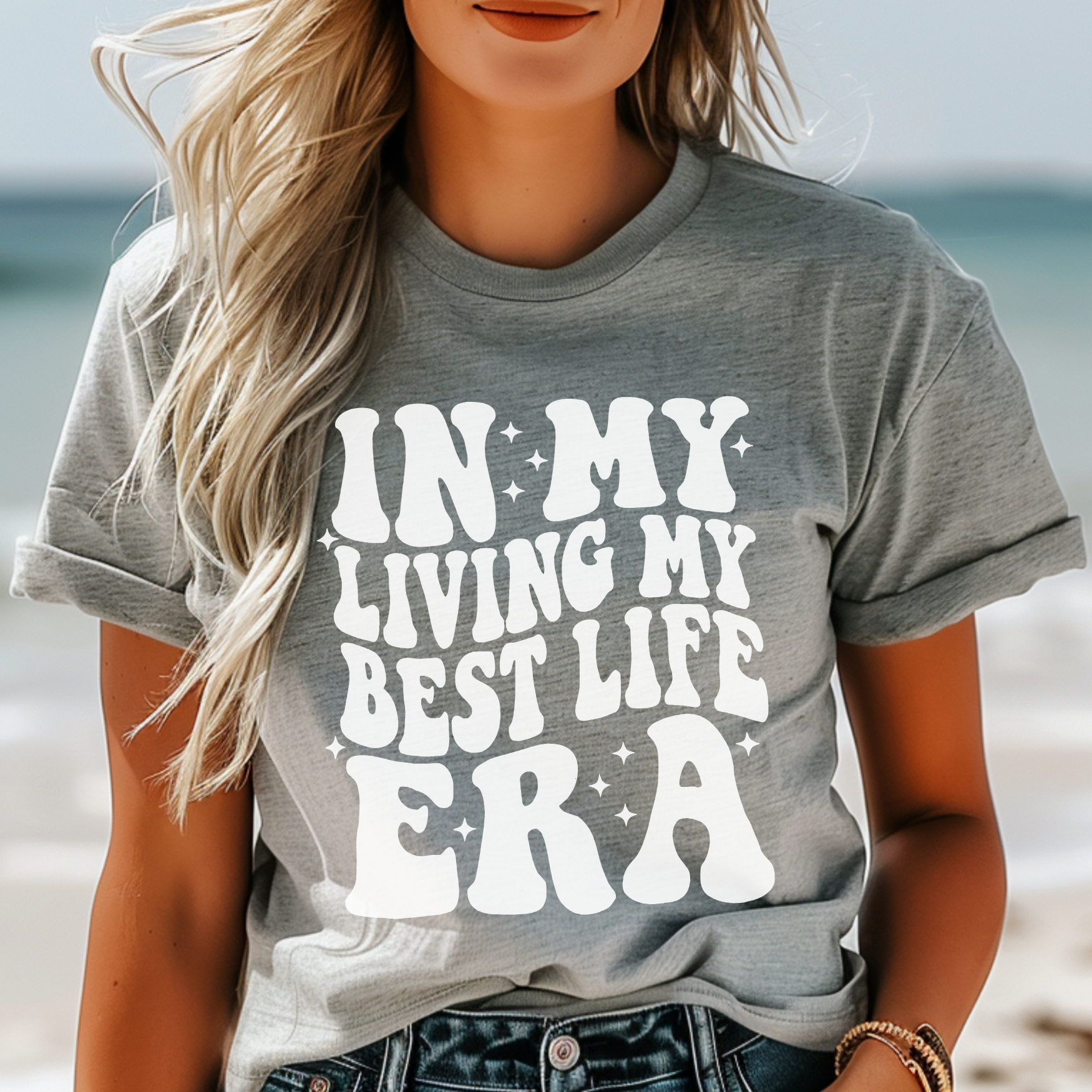 Celebrate your journey towards self-love with this stylish T-shirt. Featuring the inspiring phrase "In My Living My Best Life Era," this shirt serves as a reminder to embrace your unique path and celebrate your achievements.