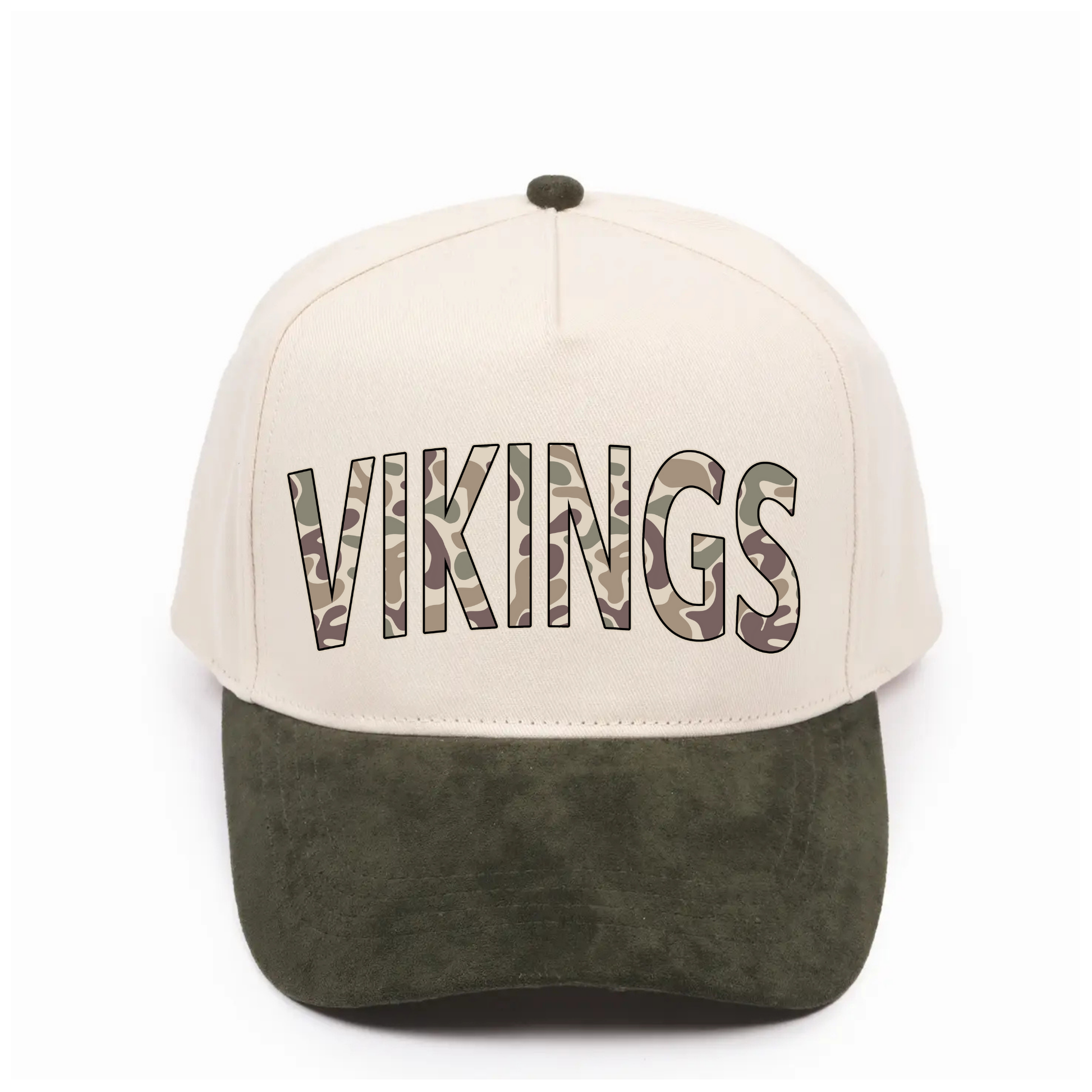 Stand out with subtle style in this cream and green cap featuring bold VIKINGS lettering filled with a camo pattern. With its two-tone design and comfortable fit, this hat is perfect for game day, tailgates, or everyday wear.