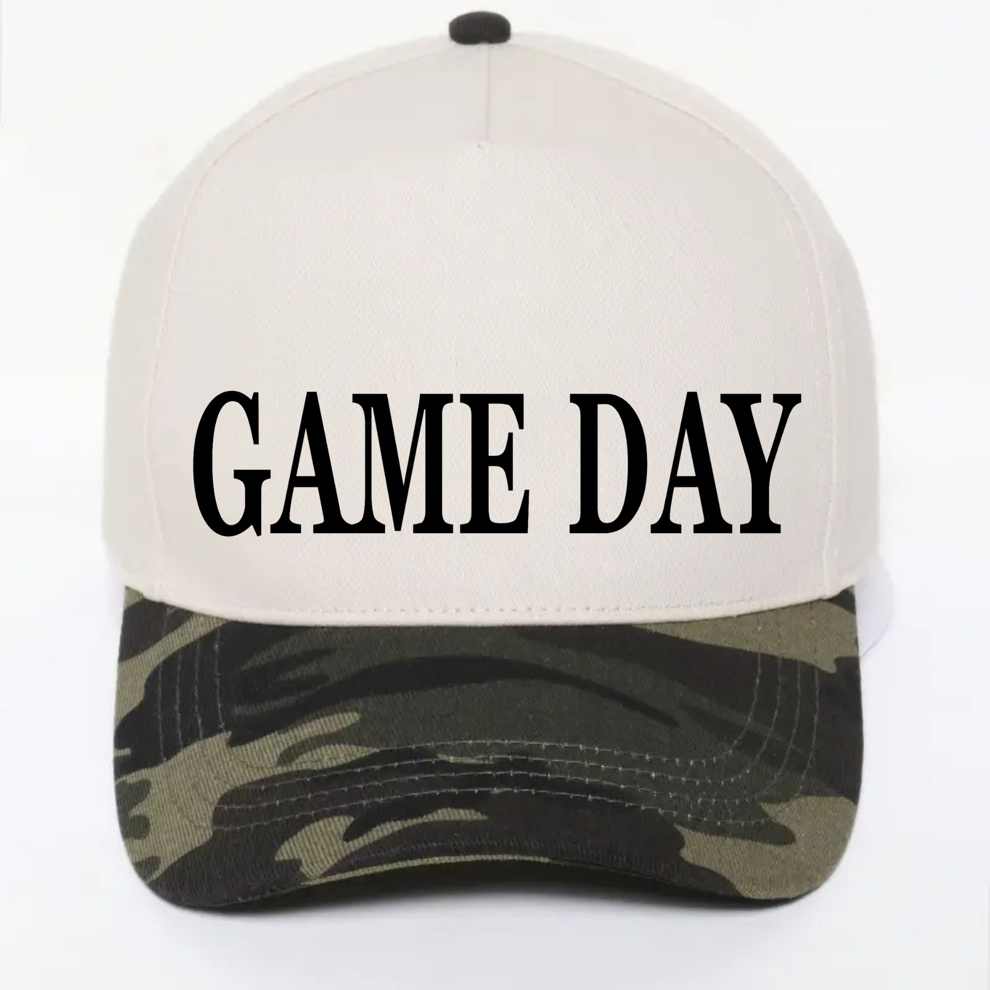 Keep your game day style simple, bold, and ready for action with this Game Day Hat. Featuring crisp black lettering and a rugged camo bill, it’s the perfect hat for fans who love a no-nonsense look with a touch of edge.