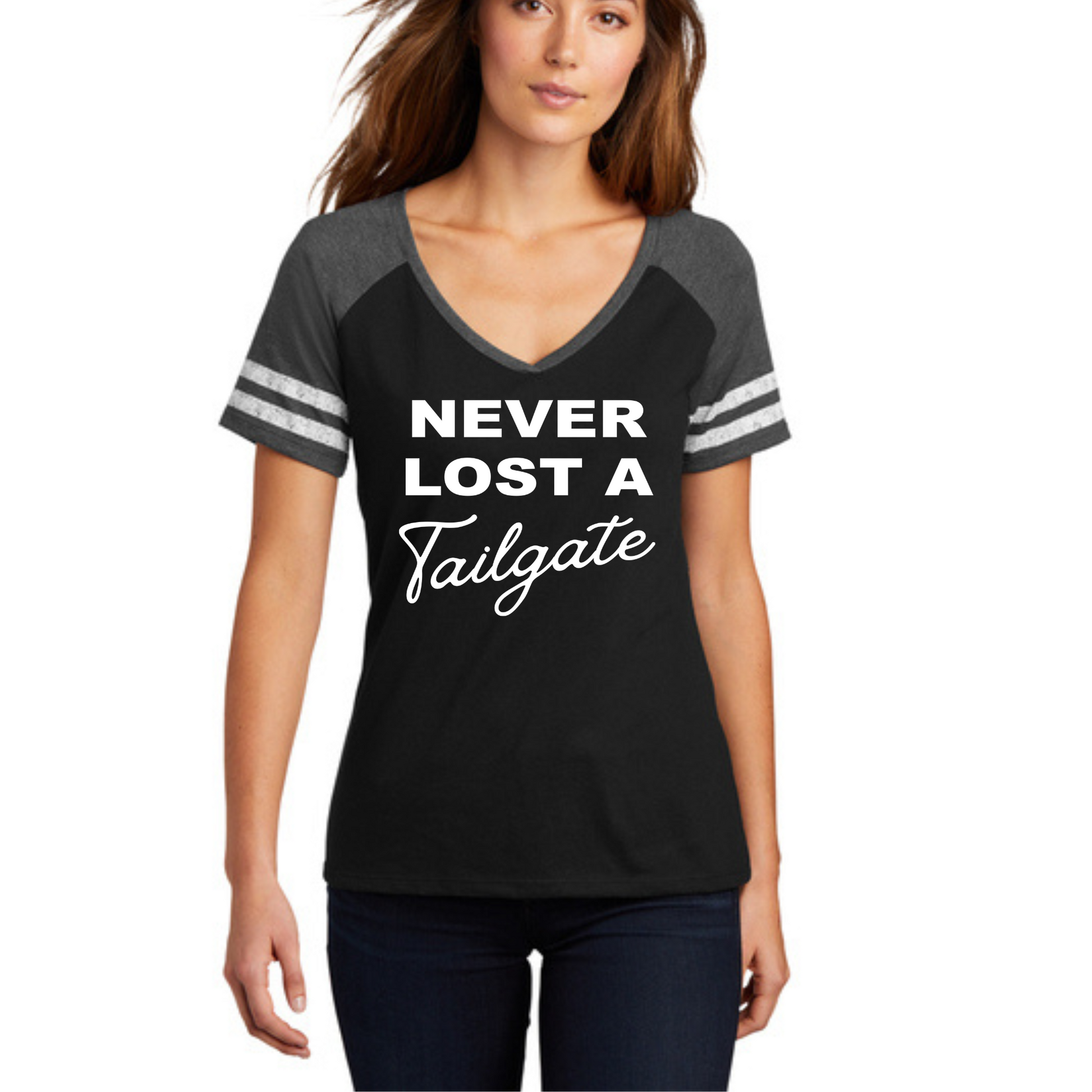 Celebrate game day in style with the Never Lost a Tailgate Jersey Tee. With sporty sleeve stripes and a flattering v-neck cut, this shirt is the perfect mix of comfort, team spirit, and tailgate humor.