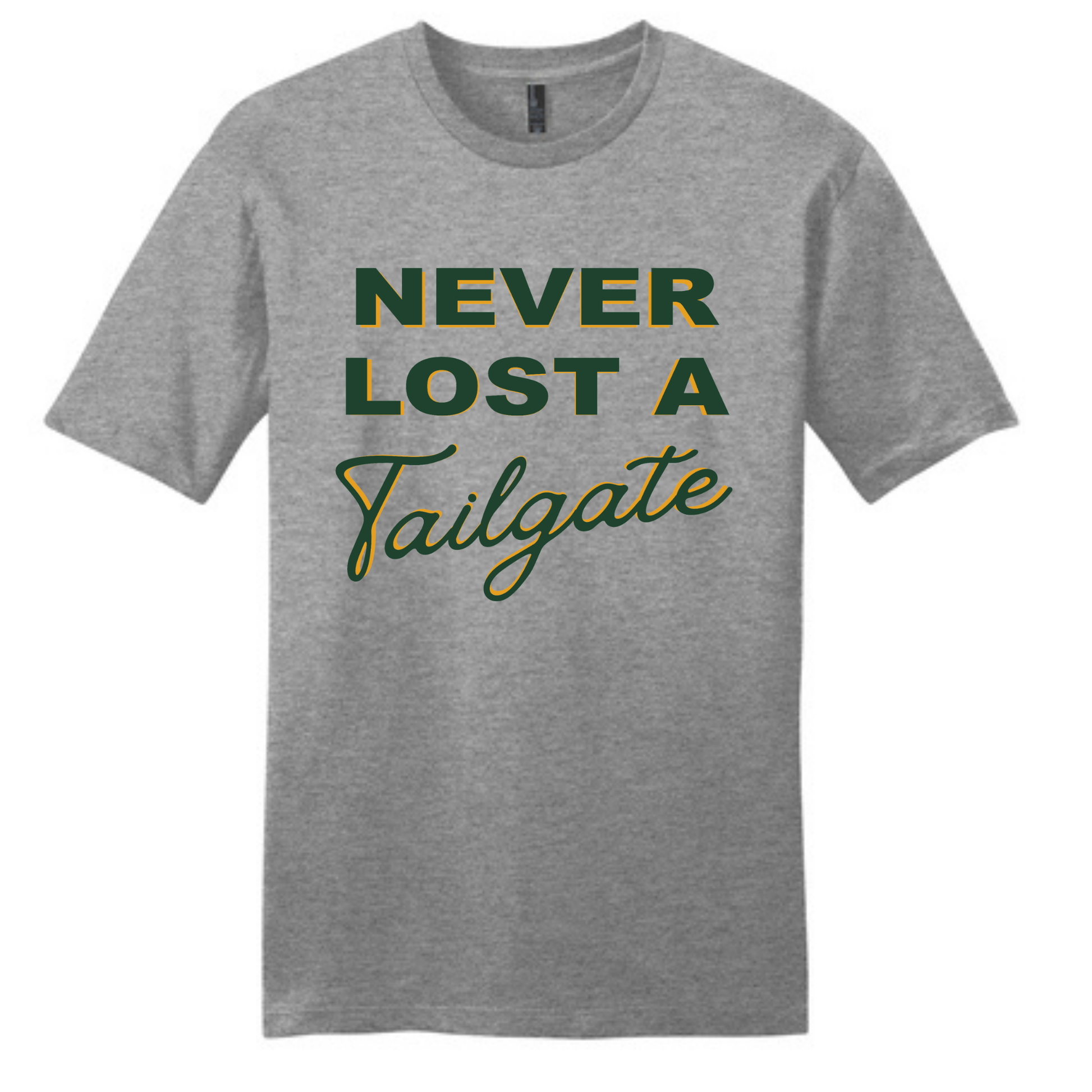Win or lose on the field, you’ll always come out on top at the tailgate! This heather gray tee proudly declares “Never Lost a Tailgate” in bold green and gold lettering—perfect for fans who know that game day isn’t just about football, it’s about the whole experience.