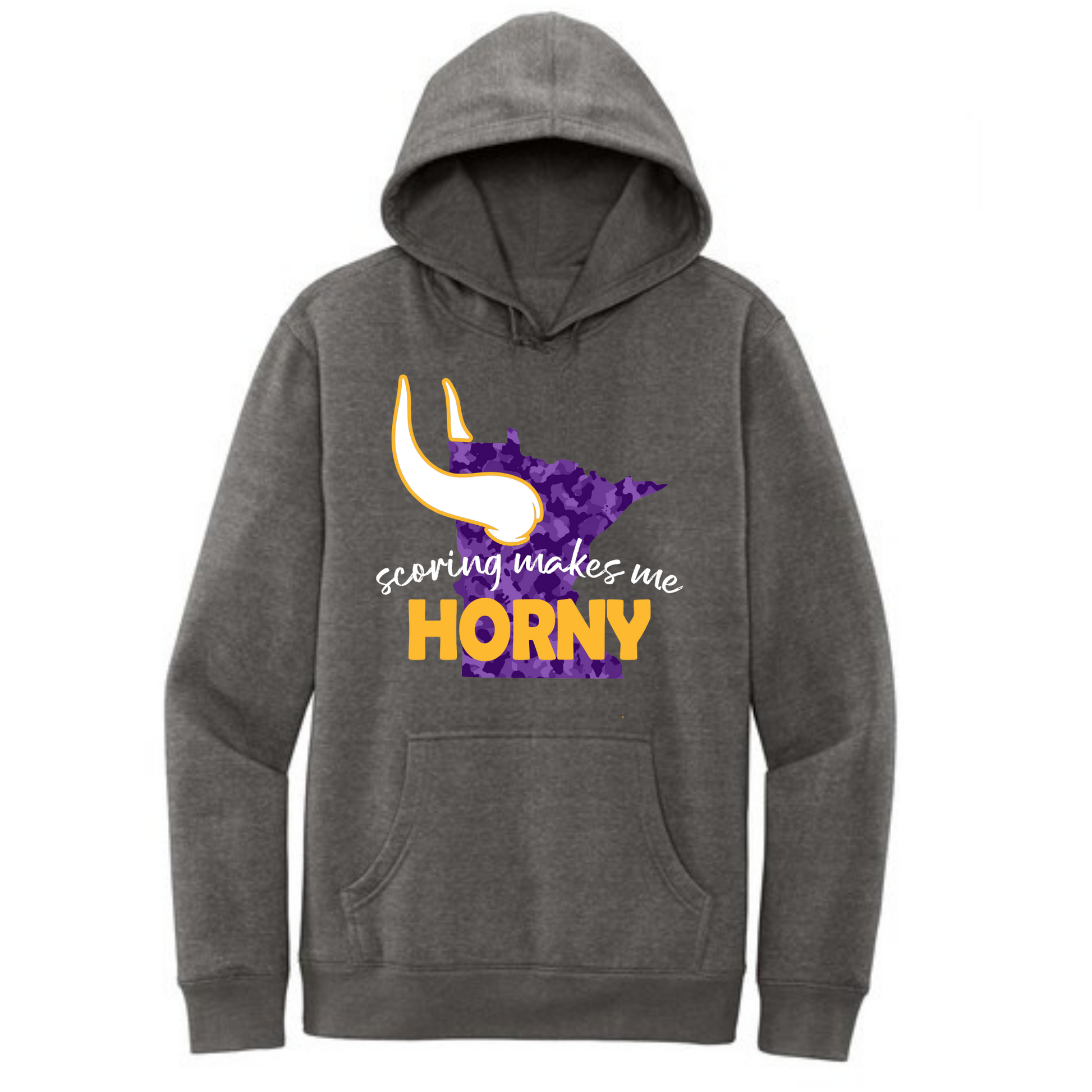 Turn up the laughs (and the volume) on game day with this playful charcoal hoodie featuring a purple Minnesota outline, oversized Viking horn graphic, and the cheeky phrase “Scoring Makes Me Horny.” Perfect for fans who like to celebrate touchdowns with a little humor, this hoodie is guaranteed to get attention in the stands or at your tailgate.
