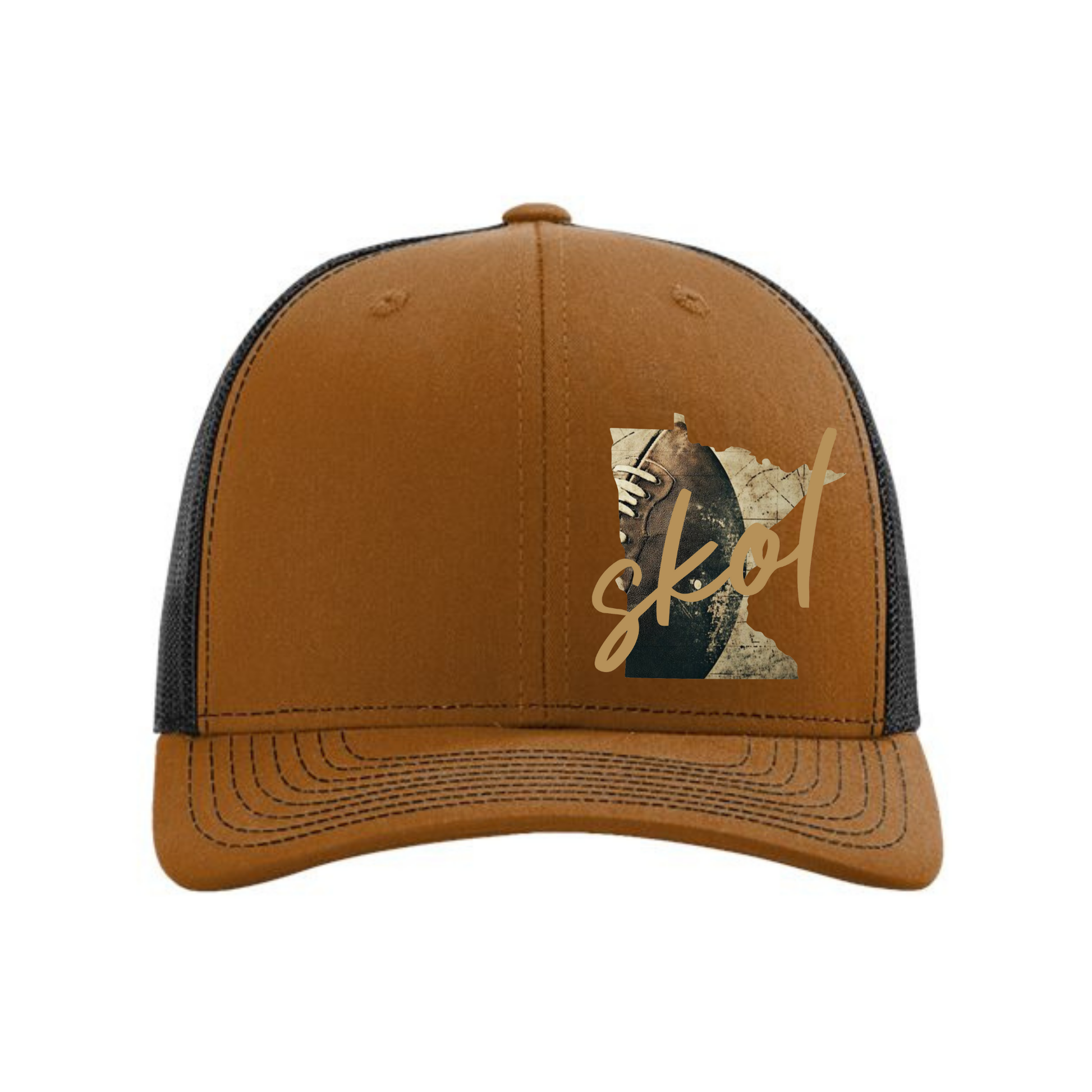 Top off your game-day look with this brown + black trucker hat featuring a bold Minnesota state outline, vintage football graphic, and “skol” script across the front. With its rustic color palette and breathable mesh back, this cap is perfect for fans who want comfort and style while repping their team.