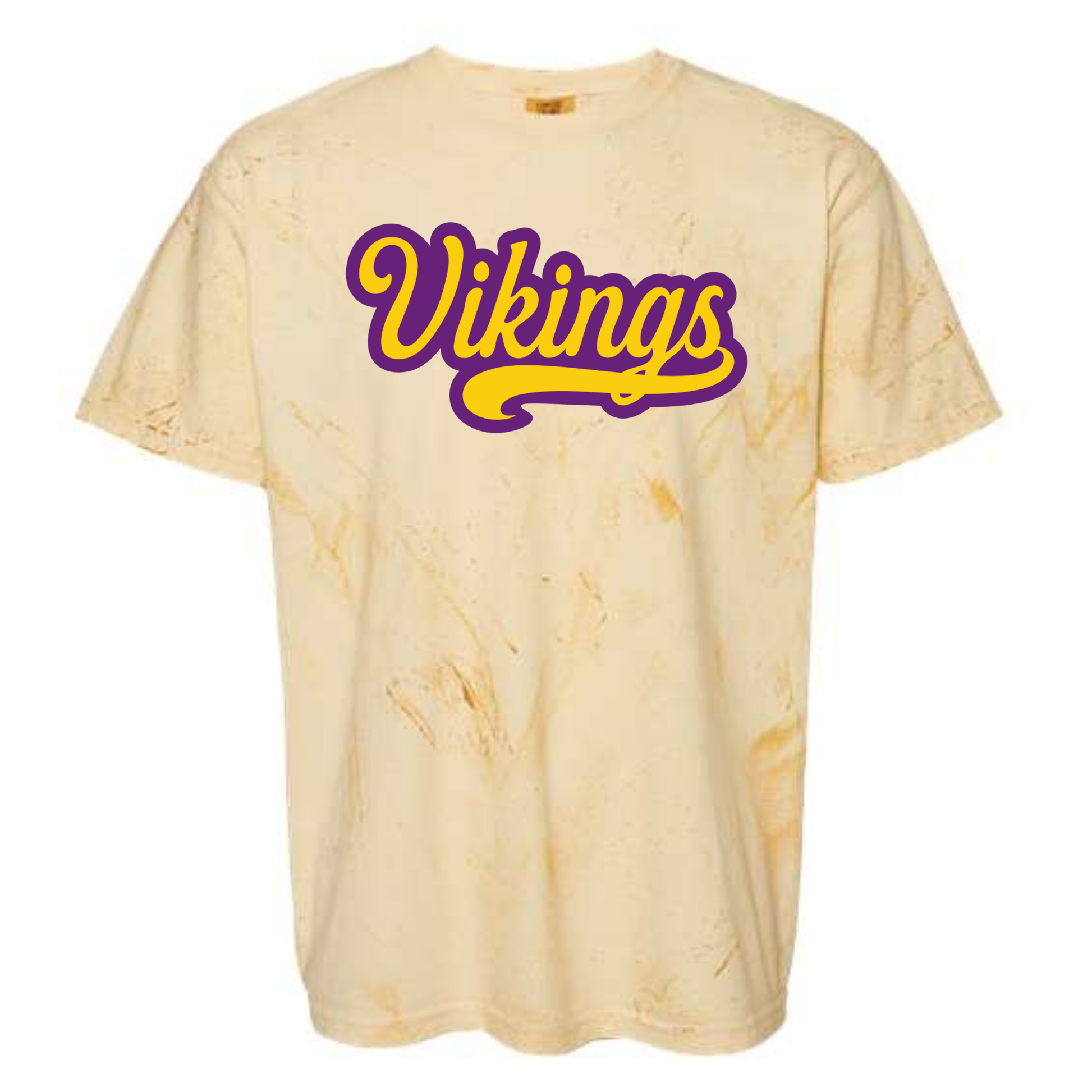 Bring some throwback flair to game day with this cream tie-dye tee featuring bold purple and gold Vikings script lettering across the chest. With its unique wash and vintage-inspired style, this shirt is perfect for fans who love keeping their SKOL spirit casual and cool.