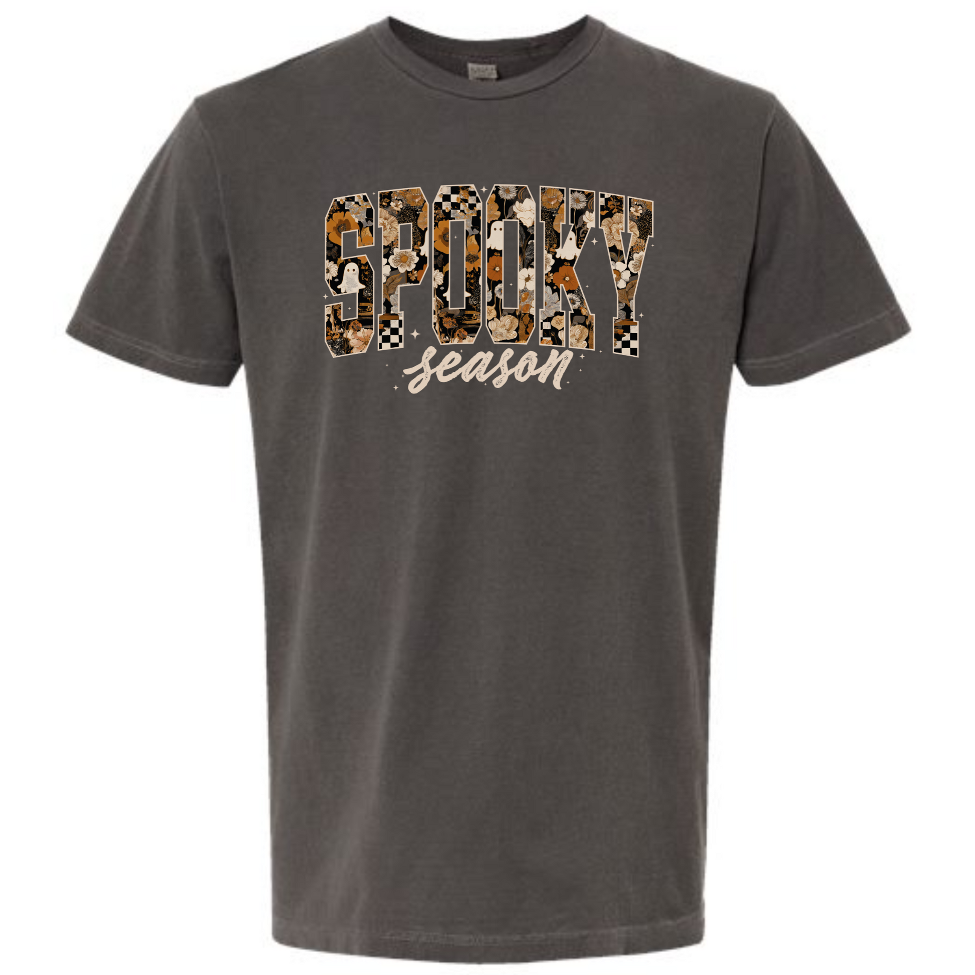 Get into the Halloween spirit with this Spooky Season floral design, featuring bold patterned lettering, and a pop of checkerboard for that trendy touch.