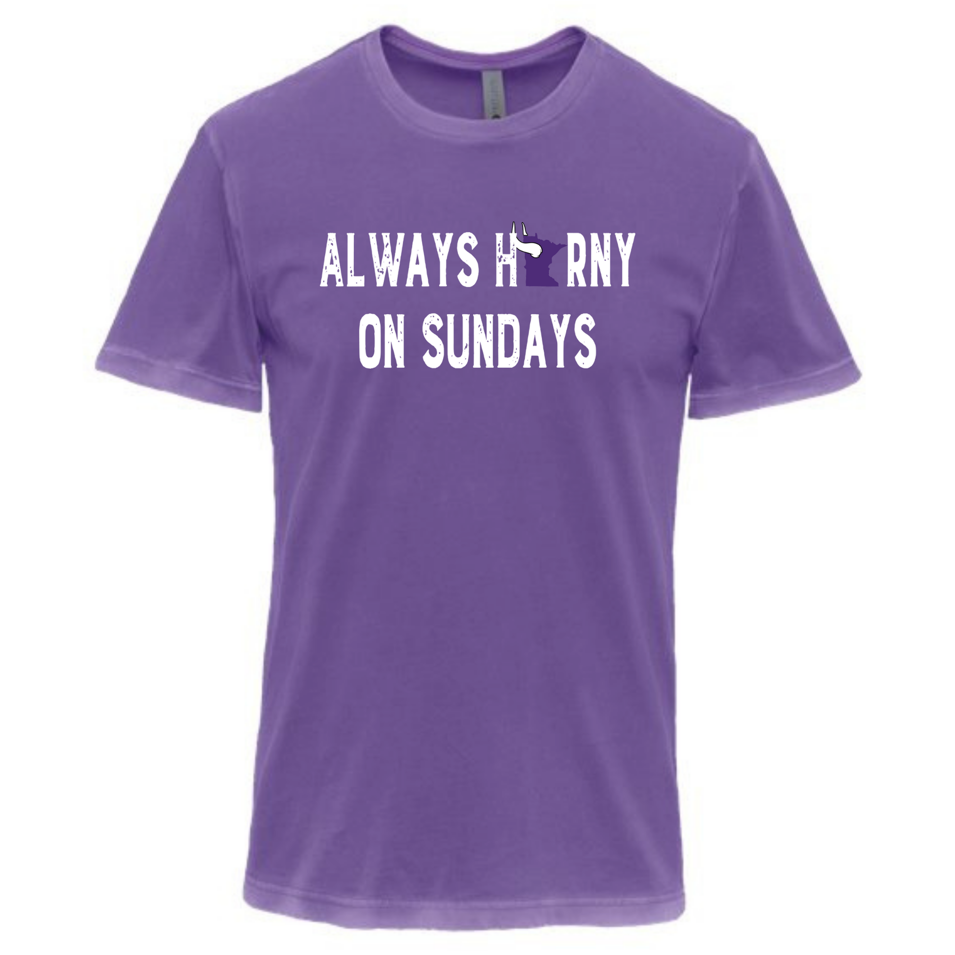 Bring humor to game day with this bold purple graphic tee that proudly declares “Always H*RNY on Sundays” – a cheeky nod to Viking horns and football fandom. Perfect for fans who like their game day gear served with a side of attitude, this shirt is sure to turn heads in the stands or at your watch party.